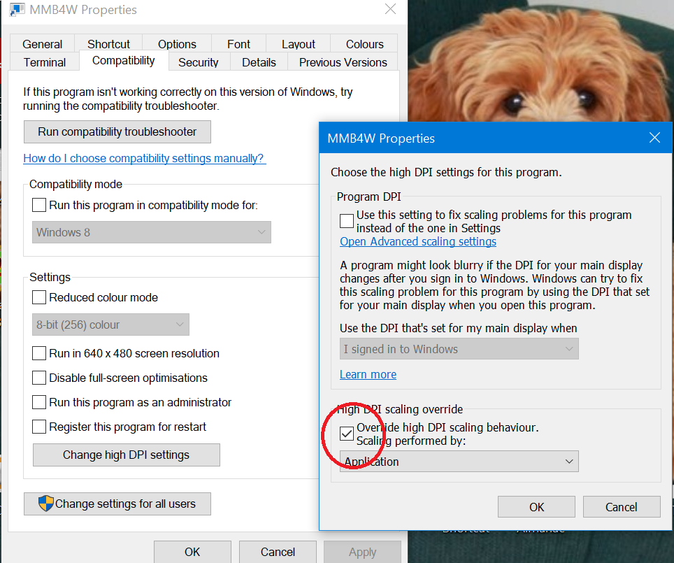 Do your laptops run high DPI. If so, that is the problem (or it is with my laptop) I created a desktop shortcut and then edited it's properties ![]() Previous versions of MMB4W were OK Edit with more information: My laptop is running Windows 10. On my laptop the MMB4W opening screen is too big for the display. With earlier beta's the sign-on text is off screen and just a hint of it is visible. Turning off DPI settings makes life better. The latest beta gets as far as opening the main window and stops. I can't tell if any of the sign-on text is there. There is no response to the keyboard. Turning off high DPI works nicely for the latest beta and I prefer it that way. Jim Edited 2023-05-31 14:11 by TassyJim |