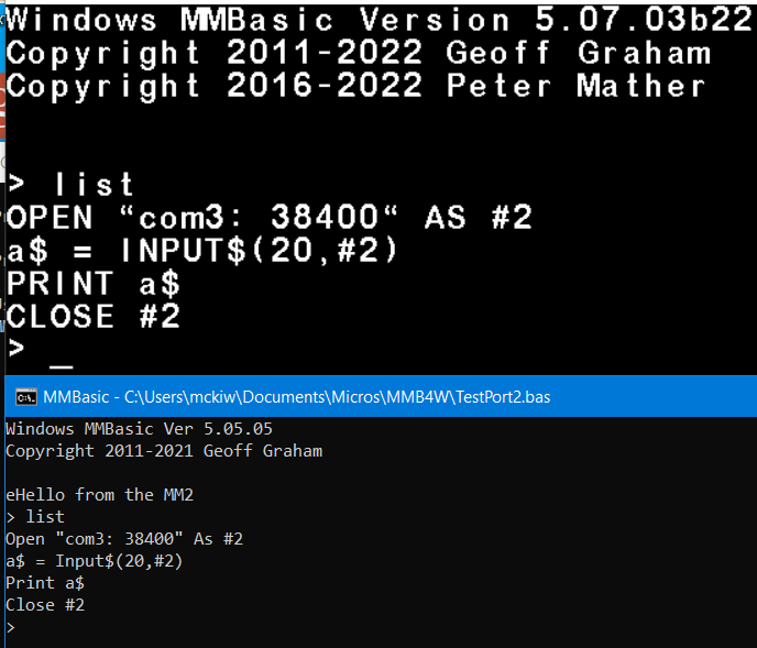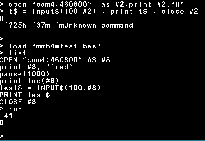 Perhaps, because the MM2 is sending this repeatedly at a rapid rate, is it filling up the coms buffer before I run the MMB4W program and this is causing MMB4W problems. So perhaps a more "real world" type test would be more appropriate. But it works with MMBasic DOS.