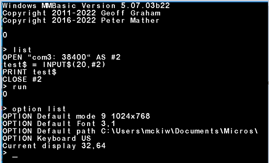 > print mm.ver 5.070322 > option list OPTION Default mode 9 1024x768 OPTION Default Font 2,1 OPTION Default path C:\MMB4W\work\ OPTION Keyboard US,1000,50 Current display 38,85 > list open "COM33: 115200" as #1 'mint ttyACM0 open "COM34: 115200" as #2 'mint ttyACM1 do print "Start loop" print #1,"test1 using INPUT" pause 1000 input #2, a$ pause 1000 print "from #2 - "+a$ pause 1000 print #1,"test2 using INPUT$" pause 1000 b$ = input$(20,#2) pause 1000 print "from #2 - "+b$ pause 1000 print "looping"