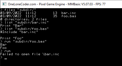 Good morning Peter, here is some more food for thought: 1. Should TIMER be initialised to 0 when MMB4W is launched? that would be a closer simulation of the CMM2. 2. Can I suggest you trim whitespace from the output of the SYSTEM command when you capture it in a LONGSTRING. The output usually ends CRLF which is no use to man nor beast. You might also consider having the option to capture the output in a regular String as that is often both sufficient and more convenient. 3. The CMM2 allows a non-existing SEARCH PATH to be specified whereas MMB4W does not. I think the behaviour of MMB4W is correct, and is what I implemented independently for MMB4L. 4. The format of error messages is different between the CMM2 and MMB4W: On Error Skip 1 Error "foo" Print "MSG: " Mm.ErrMsg$, Mm.ErrNo Error "bar" CMM2 output: > run MSG: Error in line 2: foo 16 Error in line 4: bar <newline> MMB4W output: > run MSG: foo 16 bar For what it's worth MMB4L does what the CMM2 does but without the trailing <newline>. YMMV but in my ideal world an uncaught error would display the line number, but when an error is caught Mm.ErrMsg$ would not include the line number which would instead be available separately from an MM.INFO(ERRLINE). Best wishes, Tom |