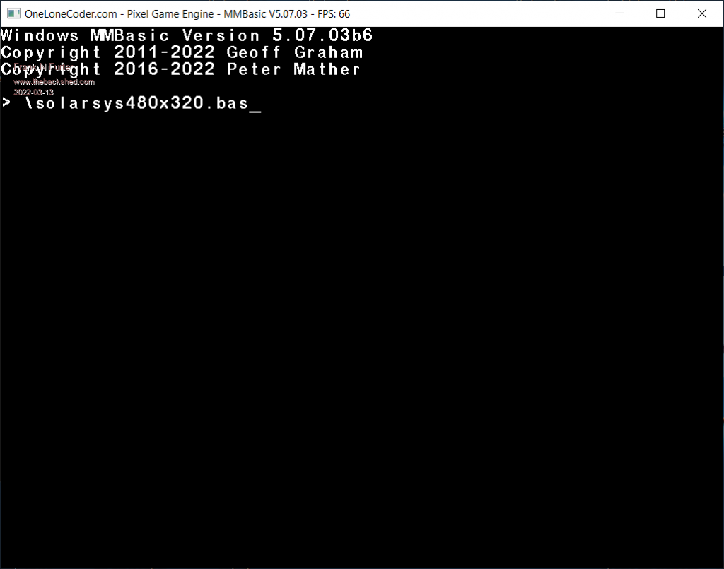 When I try to start a program with the name "solarsys480x320.bas" with MMBASIC 0 "solarsys480x320.bas" , only follwing happens:![]() That's all - nothing else happens... This program is in the same folder as MMBasic.exe "\Documents\MMBASIC" Frank |