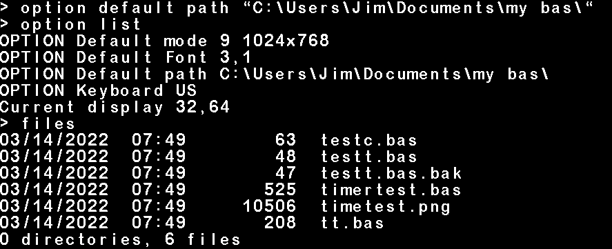 Peter, The option you give for text. Either in quotes when there is a space in the text, or, without quotes. Can that option als be applied to all commandline commands. So Run demo.bas (without quotes) Chdir wolf3d Edit test.bas Regards, Volhout |