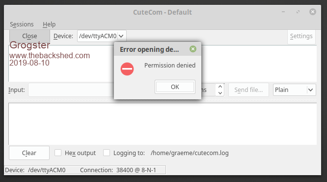 Hi all. ![]() Now I am in Linux full-time, I need a serial-port terminal. Most of my searching results in either Linux terminal softwares(not serial terminal softwares), or Windoze only ones like Tera Term etc. I want a Linux one. I did find CuteCom, and installed that, but for some reason, it won't let me talk to the COM port. If I plug in an E28 module, Linux sees it there at /dev/ttyACM0, but if I select that device and 38k4 baud, 8N1 and try to open it, Linux replies with 'Permission denied' ![]() I know I have the correct path in Linux to the E28 device, but why CuteCom won't let me open the port eludes me at present. Can anyone here suggest other terminal programs I can try? If Rob is reading this, I don't suppose you have a Linux version of your excellent GFXterm application do you? It was my go-to terminal when I was running Windoze... Smoke makes things work. When the smoke gets out, it stops! |