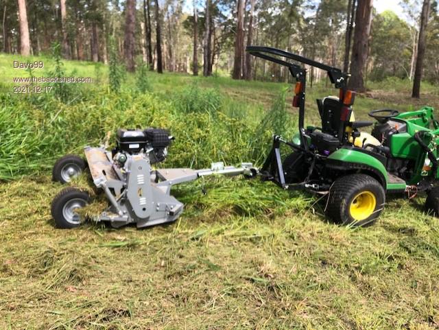 I went up to Dads bout a fortnight ago and gave the Chiggs engine a run in. Side paddock had grown a shade and needed a bit of a touch up to keep it looking nice. The Chiggs did pretty well. the flail mower is 5 ft wide so a pretty decent cut. Weak point is definitely the belts. Runs 2 B sections but not enough. Be better with a chain drive and a Diesel engine. Have a twin cyl 30 HP that would be awesome on that.
