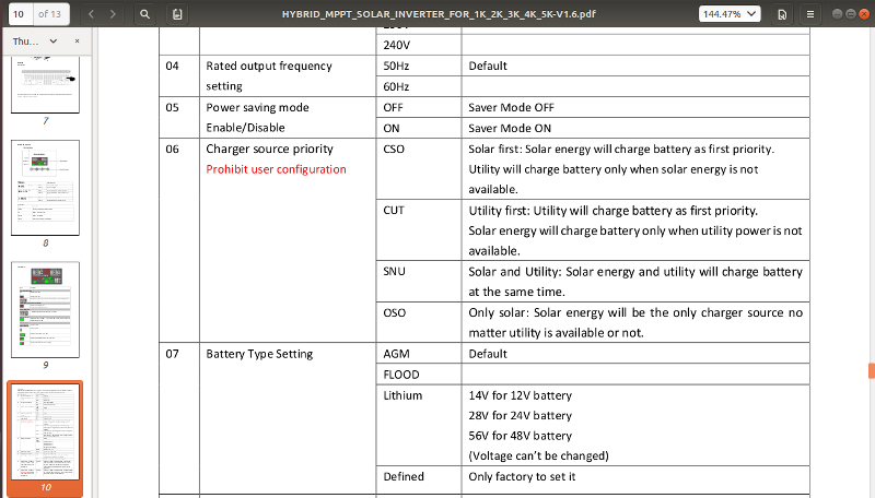 part 06. All these settings should be available, and you would want to change them to want you require, but they have in RED Prohibited User Configuration, what that means I'm not sure, but sure would not like to be locked out of those settings. The AC charging capability should have be much higher than is listed, 20Amps is nothing, should be adjustable. There are other settings in the manual that are locked out and some that wouldn't be changeable and shouldn't even be listed. Its fairly cheap if it works the way its advertised, I think its clone and sort of modified, to resemble something similar to 5048MGX or something.