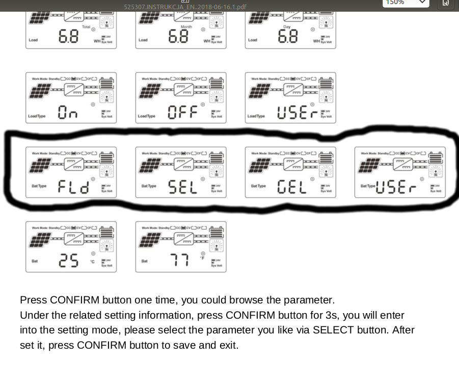 Revlac, I have the figures worked out, the issue for me is that I don't fully understand the terms they are using. I am led to believe that LiFePo4 should be charged in 2 stages, first is Constant Current. As you can see, there is no Constant Current parameter in this menu. Second stage is Constant Voltage, which I have set to 14.2V. (Battery manufacturer states 14.6V) Float is not desirable, but cannot be set to zero so I went for a figure that I hope will be harmless at worst. Boost also cannot be set to zero, so I went for a short burst at the manufacturers recommended charge voltage. Over VOltage and Under Voltage cannot be zero, so took a wild guess at those. Under & Over Recovery Voltages I didn't even try to guess because I have no idea at all. To put things in perspective, this is a single 135AH battery in an occasional use caravan, 4 or five weeks a year average usage. 340W @ 72V solar on the roof. The parameters that I can set are as follows: Constant Voltage: (14.2) Float Voltage: (12.6) Boost Voltage: (14.6) Boost Charge Time: (6 min) Bat. O/voltage: (14.7) Bat. O/voltage recovery: (14.2?) Bat. U/voltage: (12.5) Bat. U/voltage recovery: (12.5?) Max. discharge current: 100A Maximum charge current: 40A Cheers, Phill. |