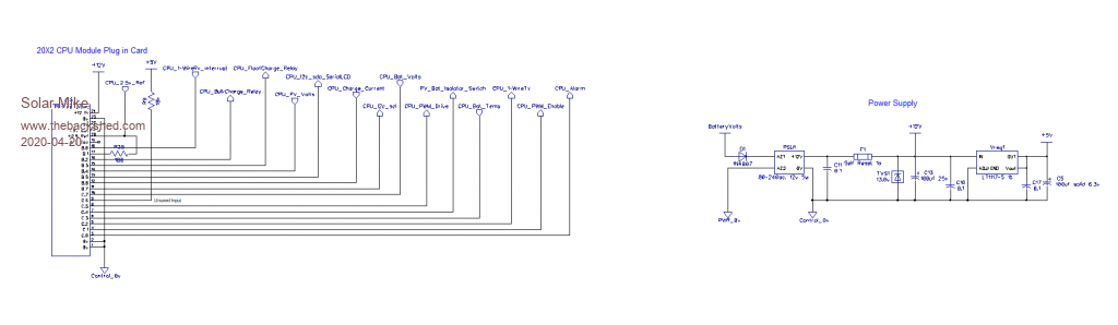 This design based on a single Picaxe 18M2+ cpu, as I found a box of them in my junk pile, thus the limited IO input count in the design, IO for temperature sensors, sensing for PV and Battery voltage, Charge Current, I2C or Serial LCD display. I haven't allowed for a keypad to enter various voltage settings, decided those set points can be entered via the code parameters.