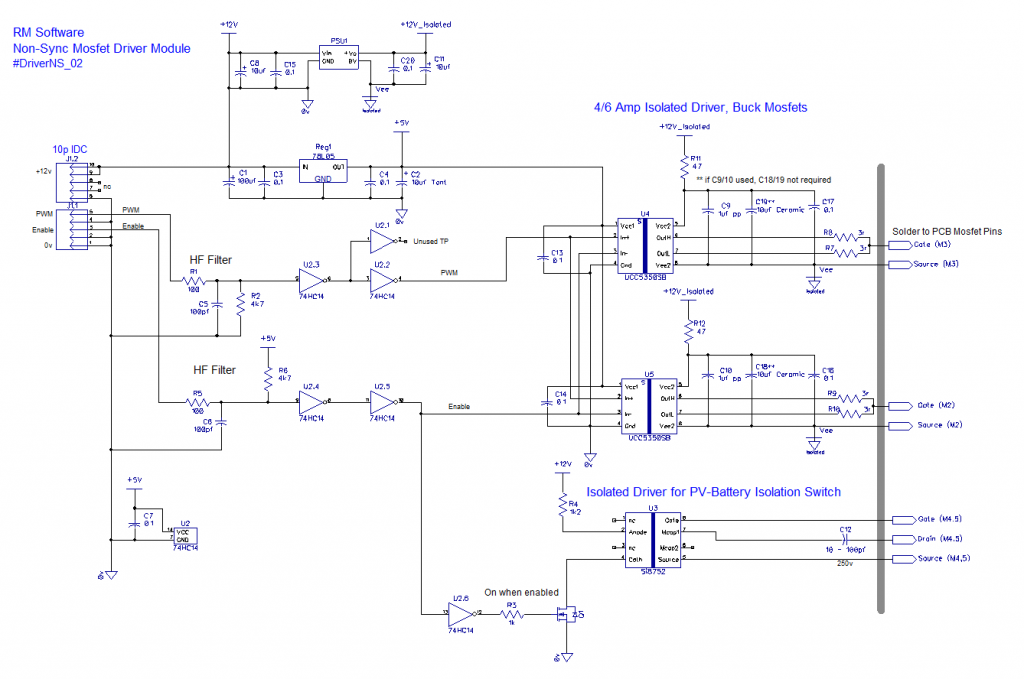 Schematic for the generic Mppt PV charge controller, can be either fully synchronous or not, depending on components. The driver pcb solders direct to the mosfet pcb pads for optimal layout.