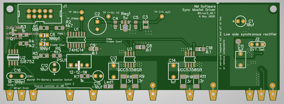 Here is the layout for the driver board, it measures 41mm high by 100mm long and sits on top of the 4 mosfet pcb pads; the mosfets are bolted 28mm apart.