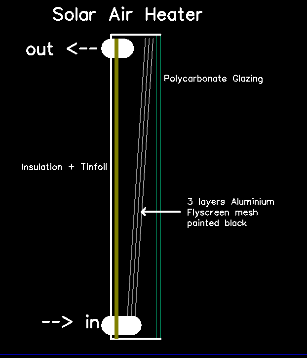Hey Dave, placing some sort of sealed boxes behind your panels seems a lot of work. The most efficient cheap solar air heater you can easily make is a timber box made out of rough sawn 6 x 1 fence palings approx 1m x 2.4m. - to fit the corflute size, recess the back with corflute siliconed in around the edges and tinfoil glued inside to that. Extra insulation on the sides doesn't make much difference. Run 3 layers of open mesh aluminum flyscreen door material painted black spaced 15mm apart on a slant, glaze with 1 - 1.5mm clear polycarbonate, >90% light transmission. Black polypropylene garden shade cloth works almost as well here. 150mm air ducts in at the bottom extended near the glazing and out at the top on the other side of the mesh, couple of 120mm computer muffin fans in the inlet driven off a small 12v PV panel. This setup will be >70% efficiency, you will be surprised at the amount of heat that it generates, if the sun is shining. ![]() Cheers Mike Edited 2021-06-03 14:18 by Solar Mike |