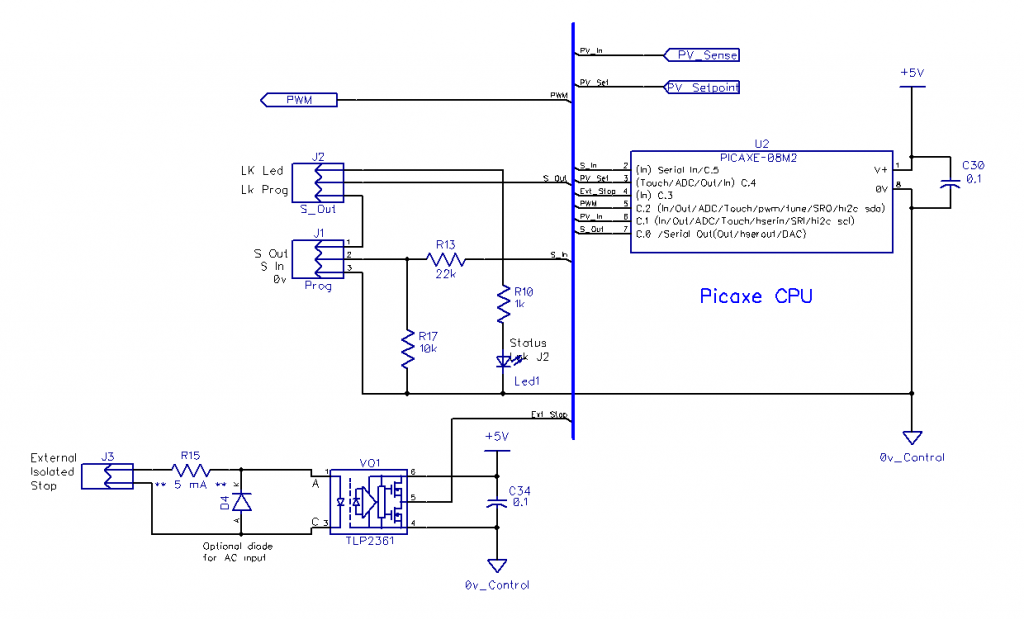 The buck converter has been implemented as LOW-side driver, using PV-ve as the 0v reference, so is linked directly to the PV making it somewhat hazardous for the unwary and requiring an isolated scope to do waveform measurements. All my controller designs are PV-ve 0v common so will be ok, some commercial controllers are not and would definitely require isolated probes.