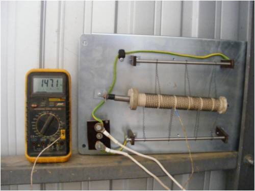 G'day Jimmy, The dumpload is basically a 240 volt mains water heater element and I unwound the nichrome wire from the former. The 2 bars are bussbars and by simply winding a few turns on each bussbar I checked the ohm's with my fluke 865 dmm, with each pass over the ohm's go down acoording to ohm's law and I was aiming for 1 ohm but ended up with about 1.5 ohms which is good enough to cover my RE input. The backing plate is a sheet of 3mm ali and the connecter on the lower left is bakealite so it gave good isolation between the bolts. For your system to dump 60 amps @ 24 volts you should aim for 0.4-0.56 ohms. For a dumpload this is a real easy one to make but ensure both bussbars are isolated and the wiring can be easily seen in the photo's above. Have fun making one but do remember to check that everything is in order and ISOLATED or murphy will pop his head up and let the sparks fly. Just remember 24 volts @ 60 amps is 1.4 Kw so be carefull in every aspect. Cheers Bryan |