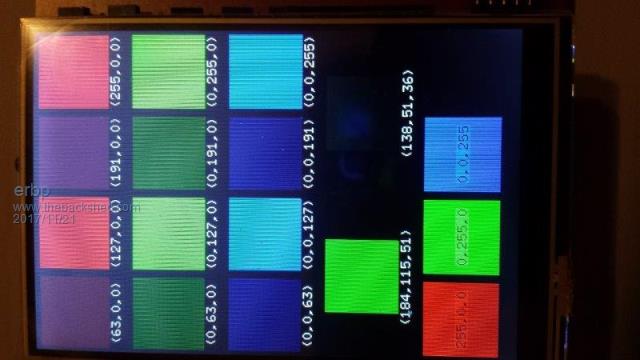I have created a small test program that displays samples of various colors (which illustrates the problem) and I have run this program on a 7" SSD1963 connected to an E64 and the colors displayed are as I expected them to be - see example screen images below for comparison.