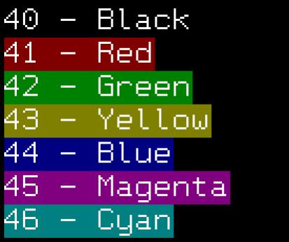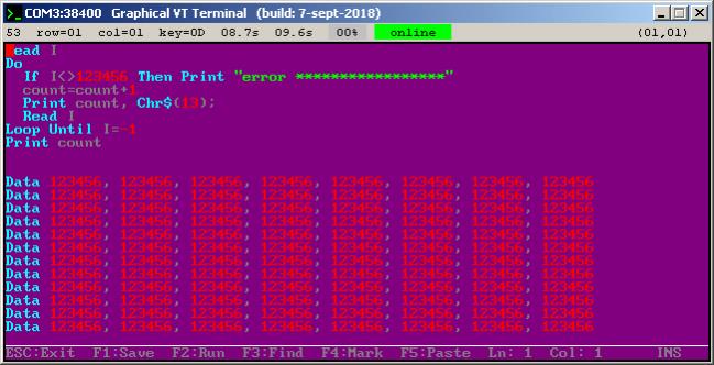 i've not so far provided any way for the user to do so, apart from using ansi escape sequences that would be overriden when starting up the editor or resetting the terminal. if the background colour were made user settable in the same manner as the foreground colour currently is (by changing the VT default), the selection available would unfortunately be rather boring: ![]() white is excluded as it clashes with the micromite editor's use of dark-white (grey) for some text. here is a purple example: ![]() would being able to do this be useful to anyone? note that in order to get a true 'black text on white background' effect, things would become far more complicated - i would have to use an altered colour palette that would mess up any basic programs that used colour themselves. TeraTerm allows altering the colour palette, with often complicated outcomes. cheers, rob :-) |