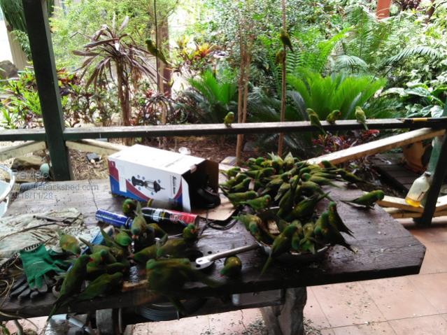 I have a lot of parrots here nearly every day (green lorikeets), they are not the types that try and make any other sounds other than there own, I'm sure they swear at each other and always the same sounds before the fights and feathers start flying, Then I can swear at them for all the noise, I also swear when one of them run's across the keyboard in the middle of typing a password on the keyboard. ![]() These are all wild birds so I have no need for any cadge except maybe to keep them out of some place, All of them are reasonably friendly but only to Me or my Farther, if anyone else turns up the birds will not come around at all. Out of this mob I know about 20 or so of them, each one of these has an individual attitude Despite there little brains they work things out quite quickly and fun to watch what they get up to, some of it is not much different to humans. They do have there little domestic disputes. ![]() Most of them I can pick up but almost always get bitten a bit, a few of them I can pat, others will just land all over you. Fun to watch what they get up to, the other day one of them couldn't find a partner so it found the end of the broom handle quite attractive, either that or the broom handle couldn't argue back. How many can fit in a frying pan. ![]() At least with these they don't need us to look after them and they don't rely on the food we give them, they are free to get there own unless the weather has destroyed the local flowers and fruit. ![]() The king Parrots have been coming around for about 10 years and usually spend 6-8 months here then head off elsewhere. ![]() Just keep them away from electronics, Multimeters have nice buttons that need to be chewed up. Other components are not sunflower seeds.. Cheers Aaron Off The Grid |