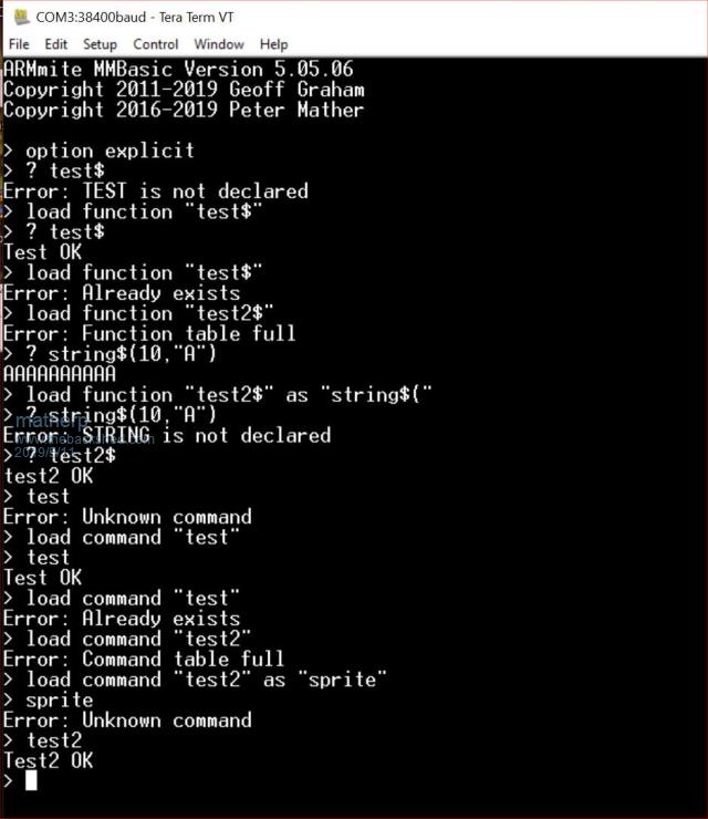 The ArmmiteH7 and the MMX have lots of flash memory available but are limited by the number of commands and functions supported by MMBasic (127 of each). Geoff has quite rightly pointed out that changing this is a big job and risks de-stabilising the code. I've worked out a way of getting round the limitation by allowing the user to select the commands and functions they want available, where necessary substituting them for existing ones. The Armmite H7 currently has 126 commands and 126 functions pre-defined out of a maximimum of 127. The attached screenshot shows how I have engineered the code to allow extra and different functions and commands to be used. ![]() The LOAD FUNCTION and LOAD COMMAND statements can be used either at the command line or in the MM.STARTUP subroutine. They cannot be used in a program as the RUN command tokenises the functions and commands so they must all be pre-establised. The function names to be replaced must include the "$" where appropriate and the opening bracket where it is shown in LIST FUNCTIONS. The command is insensitive to case and AUTORUN works as expected as long as command and function usage is defined in MM.STARTUP. Do Print test$, test2$ Test Test2 Pause 500 Loop Sub mm.startup Load function "test$" Load function "test2$" As "string$(" Load command "test" Load command "test2" As "sprite" End Sub I think it is very unlikely that a user couldn't find unused commands or functions to replace in any specific program so I think this approach gets round the current limitation without compromising stability of the core MMBasic code. Thoughts on the approach and all ideas for new functionality (e.g. complex number support) appreciated. |