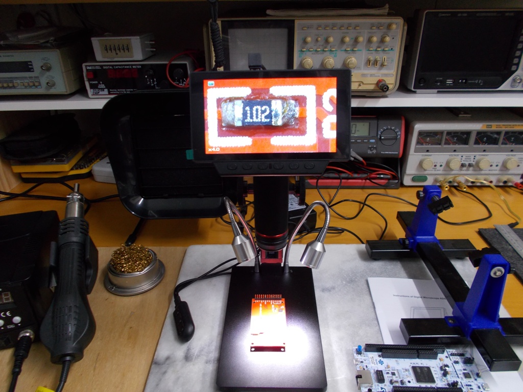 BTW Just as a comparison of the different Lens on the 302, the following photo is the same PCB board and resistors as shown about half way down on the previous page. 1: The lens is around 125mm away (cranked right up) 2: Digital Magnification at 4. I could fit the soldering station in there Mike. NANO Inverter: Full download - Only Hex Ver 8.1Ks |