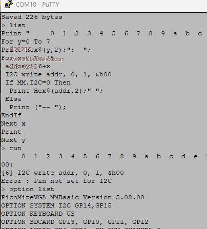 Here is an older I2C-Detect.bas program which searches for I2C devices. Since you're setting up I2C with an OPTION, you need to comment out the SETPIN and I2C OPEN lines. You can change I2C to I2C2 to check that setup. ' i2cdetect like program ' Set Pins! SetPin gp0, gp1, I2C ' Open first I2C I2C open 100, 200 ' Prep table Print " 0 1 2 3 4 5 6 7 8 9 A B C D E F" ' loop col/row For y=0 To 7 Print Hex$(y,2);": "; For x=0 To 15 addr = y*16+x ' calc address I2C write addr, 0, 1, &H00 ' write zero to that address If MM.I2C=0 Then ' check for errors Print Hex$(addr,2);" "; ' found one! Else Print "-- "; ' nothing here.. EndIf Next x Next y PicoMite, Armmite F4, SensorKits, MMBasic Hardware, Games, etc. on fruitoftheshed |