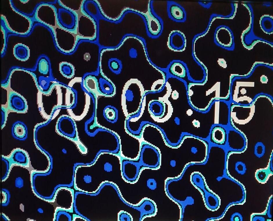 FRAMEBUFFER WRITE N XCntr%=MM.HRES\2:YCntr%=MM.VRES\2 XC%=XCntr%:YC%=YCntr%:CC%=1 XDir%=1:YDir%=1 Do TC%=CM(1) For i%=1 To 14:CM(i%)=CM(i%+1):Next CM(15)=TC% For i%=1 To 15:Map(i%)=CM(i%):Next Map Set Inc CC%,-1:If CC%=0 Then CC%=15 CLS Text XC%,YC%,Time$,"CM",6,,Map(CC%) Inc XC%,XDir%:Inc YC%,YDir% If XC%>XCntr%+32 Then XDir%=-1 If XC%<XCntr%-32 Then XDir%=1 If YC%>YCntr%+95 Then YDir%=-1 If YC%<YCntr%-95 Then YDir%=1 Pause 50 Loop |