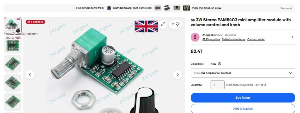 Complete with volume control and knob, 3.5mm stereo input socket, and PCB T-block for power and speaker connector.  Pretty good value, I think.