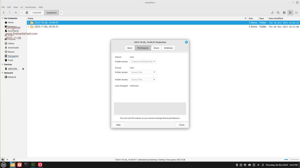 ADDITIONAL: Found out with research, just to redirect the RSYNC based Timeshift app, to create the snapshots on an external USB drive, so I have created one of those on an ADATA drive as of tonight, and I will do another one on another USB disk tonight, so that I have at least got some external backup thing-y's for my LMDE6 setup. EDIT: I would still like to know how to change the permissions of the Timeshift folders on the system SSD, so I can copy these to a dedicated USB SSD I am planning to use for this purpose. Edited 2025-11-06 15:55 by Grogster Smoke makes things work. When the smoke gets out, it stops! |