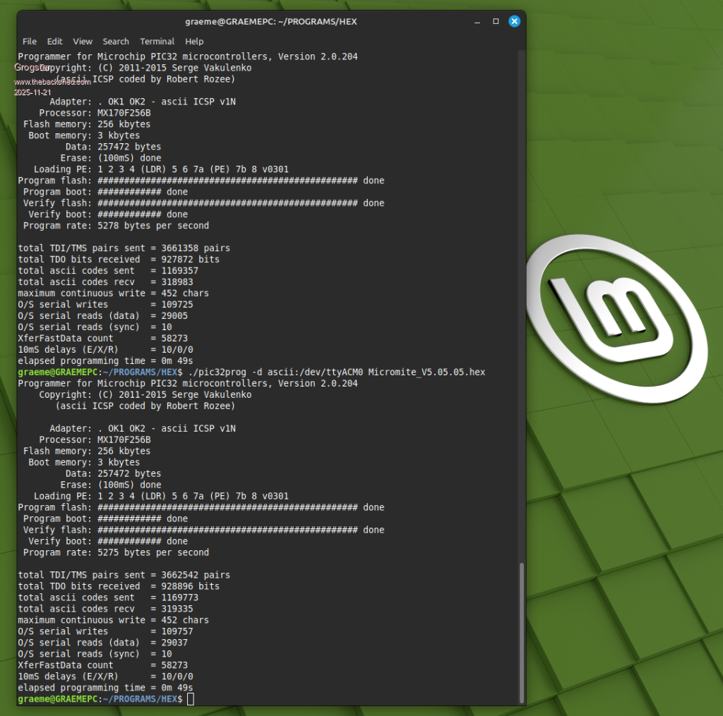 Navigate to /PROGRAMS/HEX (in my case), copy-and-paste the command from my "Useful Linux Terminal Commands" file, to the terminal, hit ENTER, program the device. The HEX folder, contains all the PIC32 HEX files, and the Linux version of the PIC32PROG utility.