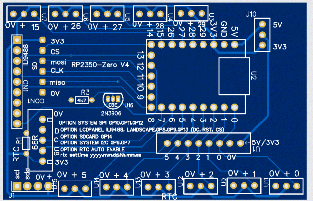 RTC module, SD card module, ILI9341 or ILI9488 (no touch), I2C, 10 pins broken out to 3-pin headers, one 6-pin port alternatively using pins 0-5 with GND and optional 3V3 or 5V power. ![]() ![]() An earlier version of this was the first one I've had where the 680 resistor failed to keep the ILI9488 MISO signal from fouling the SD card. So I used a 2N3906 PNP transistor to gate the MISO signal with *CS. Gerbers are attached. JLCPCB shipping to the U.S. went up from about $3.30 2 weeks ago to $6.60 now. Still, 5 pcbs for under $2 each is quite a bargain compaired to what I paid a dozen years ago. Gerber_RP2350-Zero-breakout_V4.zip PicoMite, Armmite F4, SensorKits, MMBasic Hardware, Games, etc. on FOTS |