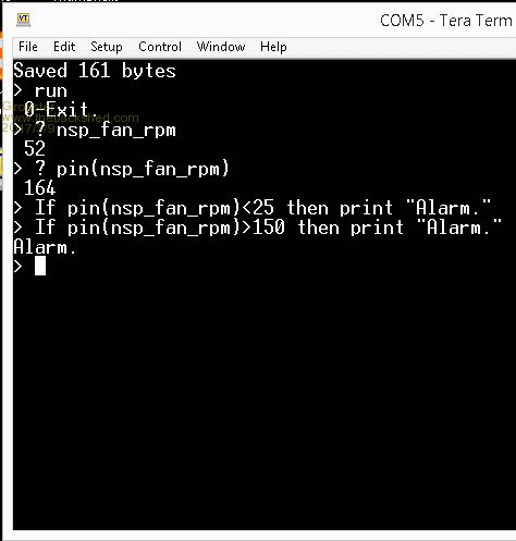 If I ask for the result on the pin with the fansink fan tach on it AT THE COMMAND PROMPT, it works fine. The result is as expected.