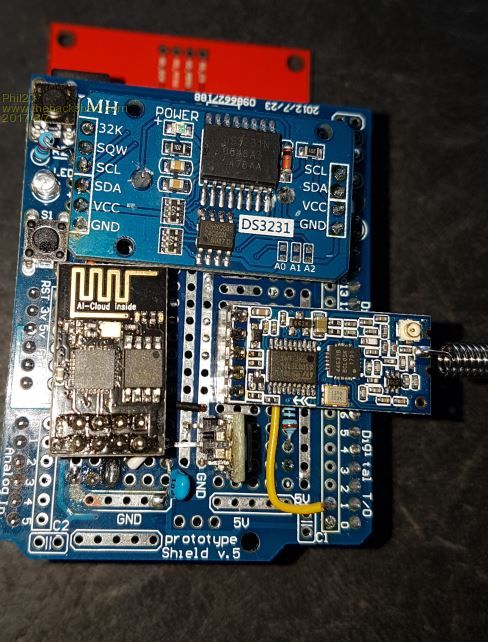 Anyone tell me where I'm going wrong here? All my MM's have ESP-01's & HC-12's. Wifi on the console, 433mHz on Com1. All working OK & even the dodged up breadboard experiments were fine, but the one pictured below is giving me grief. Wifi is fine on it. but the HC-12's not receiving. If I remove the Wifi module it receives.... Voltages are fine. 3.33 & 5.02, & the ESP has it's own AMS1117-3.3. 0.1µF on input & output & also a 100µF on the 3.3V out. The HC-12 just gets it's power from the E100, but has 0.1µF across Gnd & Vcc. The similar thing I made for the CGMicro 64+ works fine, & I don't think it's the 2 transmitters being close, as I tried the moving the HC-12 to flyleads & still the same. My other E100 has both modules on a Proto board making a 3 layer sandwich & it's fine... Have checked both E100's, swapped ESP-01's & HC-12's around & all modules work fine elsewhere. Even tried jumping a 1000µF electro across the HC-12, no change. Got to be something dodgy with my power... Any suggestions? Thanks Phil. |
