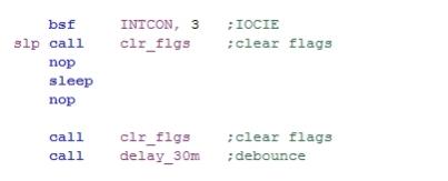 I'm simulating with MPLAB. I did that - no difference. IOCCF Is still 0x00. Here is the sub routine that clears the flags. clr_flgs ;Clear flag(s) IOCAF & IOCCF banksel IOCAF ;selects Bank 7 movlw 0xFF xorwf IOCAF, w andwf IOCAF, f ;this resets IOCAF - see spec p. 147 movlw 0xFF xorwf IOCCF, w andwf IOCCF, f ;this resets IOCCF - see spec p. 147 banksel PORTA ;selects Bank 0 return |