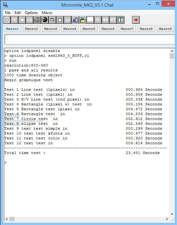 Try option lcdpanel ssd1963_5_BUFF,rl This writes to a buffer first and then modified areas of the buffer are output to the screen. Some tests may be faster, others slower. The advantage comes when as a user you control when the write comes using OPTION AUTOREFRESH OFF/ON and the REFRESH command. Set OPTION AUTOREFRESH OFF and then run the tests. In this case only the buffer is updated, nothing on the screen unless you put a REFRESH command at the end of each test. |