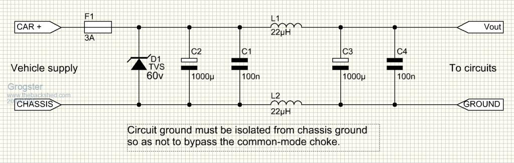 Ahhh, OK then. So circuit-ground must be isolated from chassis ground. Is that correct? This kind of idea: ![]() I added TVS diode D1, but other then that, the rest is what I expect this filter to be. D1 would need to be a reasonably juicy one, so it can dissipate the energy if the voltage ever peaks above 60v. But as the alternator's own regulator will pull that voltage back down to where it should be in a load-dumping situation, and that this SHOULD happen with about 100mS or so, we should only need to suppress the short spikes. I'm thinking 6A diode at least. Thoughts? Comments? EDIT: Rob beat me! The SEPIC converter I am using has a common ground, but so long as IT'S ground and all the circuit ground, is on the ground side of the common-mode choke and NOT on the chassis side of the choke, that's OK - correct?Smoke makes things work. When the smoke gets out, it stops! |