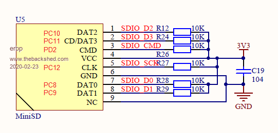 A question for Matherp. I have an Armmite F4 and would like to fit an external SD Card socket in parallel with the Micro SD socket on the module. This is due to the fact that for my project the F4 module will be mounted in a position such that the on-board socket will difficult to access, so I would like to mount the external SD Card socket in a position where it can be accessed easily to change SD Card. I have a Grogster "E100 SD Holder 1A" module that would be ideal for my requirements, but am unsure about which signals connect where. Below is a section from the STM32F407VET6 circuit diagram showing the connections to the SD Card socket. With reference to the main part of the circuit diagram I have annotated this diagram to also show the "pin numbers" on the module that the various signals appear on. ![]() The E100 SD Holder module has the following signals: 3v3 CS MOSI CLK MISO CD WP GND Ignoring 3v3, Gnd and WP, can you please advise which pins the remaining signals on the external card holder should be connected to on the F4 module? Thanks, Phil. |