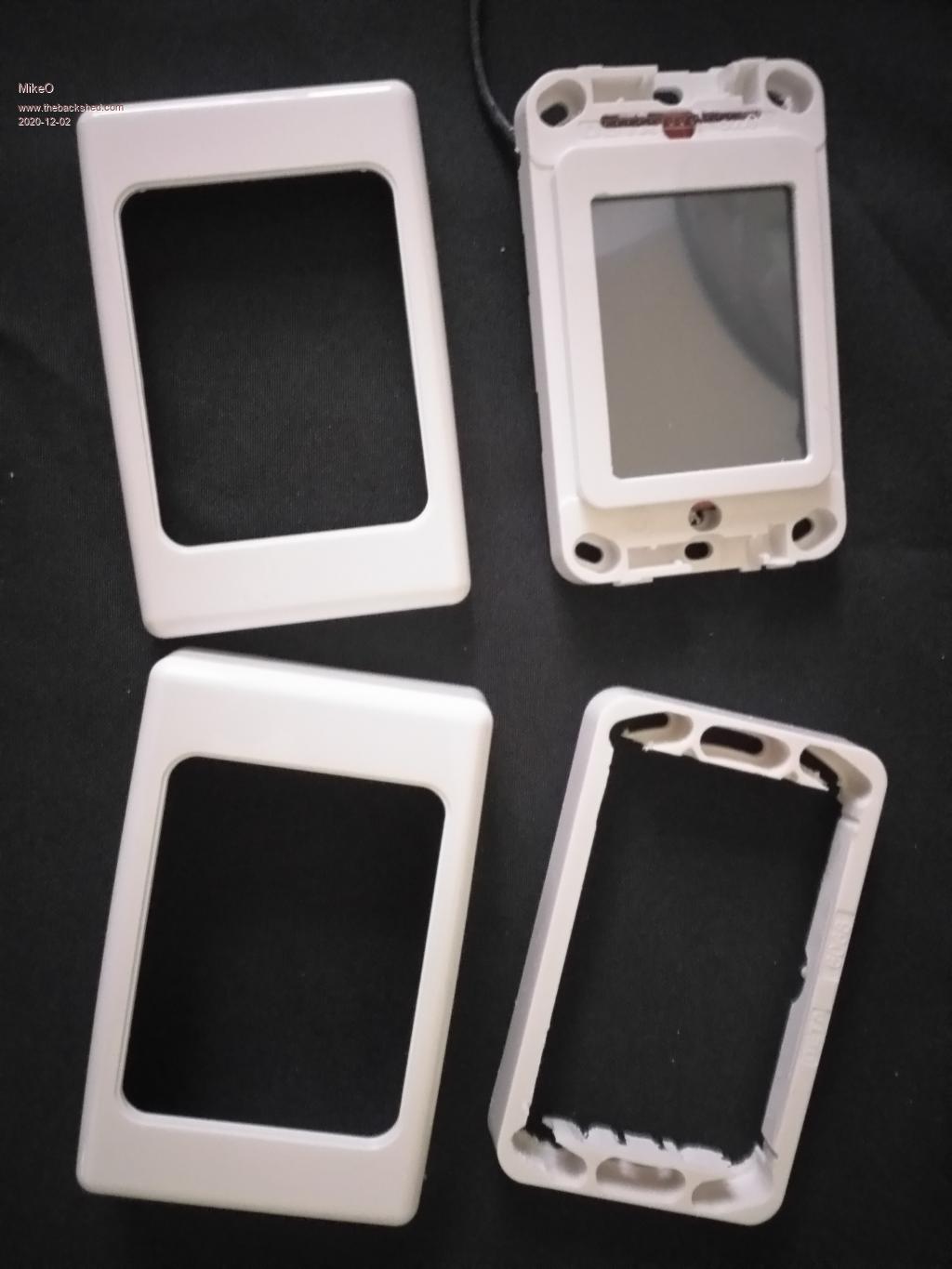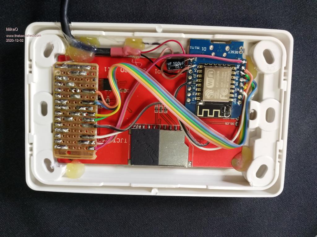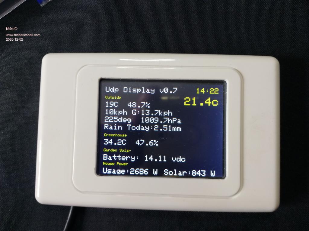 This pair of photos shows a 2.8" display mounted in a normal wall plate just 13mm deep. In this case a ESP8266 D1 Mini is driving the display but it could be micromite etc. For simplicity there is small slot outlet for the usb power lead for total surface mounting but you could also bring the power via the wall of course.