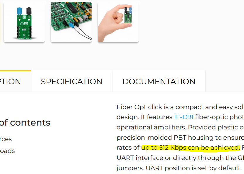 Can anyone see why this Click module is limited to 512Kbs? Seems really slow to me. I have submitted a question to Mikroe but they take forever and a day to respond. Schematic is in the attached PDF. fiber-opt-click-schematic-v201.pdf Craig |
