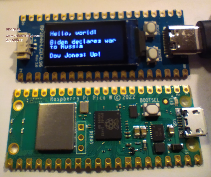 I have a dream. Two (or more?) picos cooperating, each one contributing its special features. For example use pico-1 (RP2040-LCD) as display and use pico-2 (pico w) as interface to the world. This way pico-2 could use its excellent internet capabilities to get information i.e. extract news from a website, which could be displayed by pico-1. Question: What would be the best method to interconnect the two picos using PicoMite/WebMite ? ![]() -andreas |