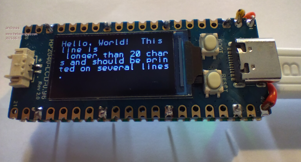 Hello lizby, very good stuff - I will test it! Currently I'm using this(the code changes every minute;) to get a CLS command send over the line - but yours is more flexible. I was even thinking about some kind of "POSTSCRIPT" language to send by the serial line;) Do ' display text received by serial interface If Loc(#1) > 0 Then t$ = Input$(Loc(#1),#1) Select Case t$ Case "CLS"+Chr$(13)+Chr$(10) CLS linepointer = 0 Case Else lcdshow(t$) End Select EndIf Pause 100 Loop Today I have received tiny cables with a connector fitting into the tiny accu connector of the RP2040. The colours are wrong (black and red!). Then I saw that it would be better to connect VSYS to VSYS and not VBUS to VBUS as I did it. The diode seems to "protect" the WebMite pico w from power sourcing from the battery connector of the RP2040. So I will change that hardware design. ![]() -andreas Edited 2023-06-11 01:17 by andreas |
