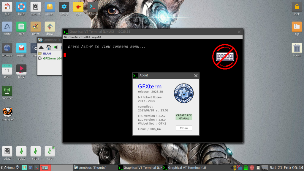 GFXterm for Linux exists as just a standalone ELF binary, not any sort of "appimage" or similar, and primarily requires X11 and GTK2 be installed. Puppy Linux should provide these so should work without issue. if there are problems, just run it from a command line and messages will be printed out for anything that is missing - one deficiency of Linux is that if you just click on a binary to run it (ie, not run from a command line) and something goes wrong, then you get no on-screen feedback; just nothing happens. i'm interested to hear how small a system you can get GFXterm running on! remember, there is also the win32 version that can run on winXP, but should (in theory) work with win2000 or even win98SE. way back when i was developing it on winXP the machine i used was an EM350/NAV51 netbook that had a 10" screen, 1gb of RAM, and an Intel Atom N450 processor. cheers, rob :-) Edited 2026-02-21 00:17 by robert.rozee |