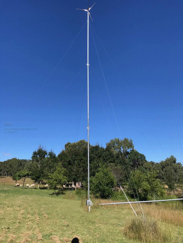 Years ago I had a 1500w Dunlite up 24M and it was a failure due to up draft amongst trees. It would run great for 20 seconds then do a 360 rotation and keep repeating that over and over. In the photo below it is looking at it from the SW, westerly winds worked well but the predominant E - SE winds were a failure. Had to pull it down a number of times to fix it, climbing that tower and lowering a 50KG plus generator is not something I will be doing again. I like that telescopic idea if it had 3 or 4 10M sections and a pivot halfway up the first one.