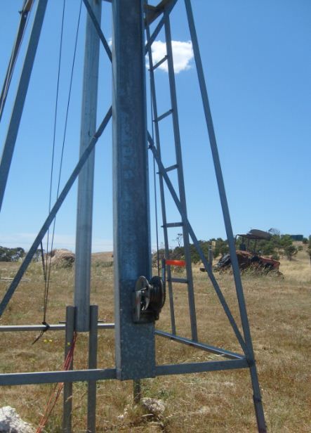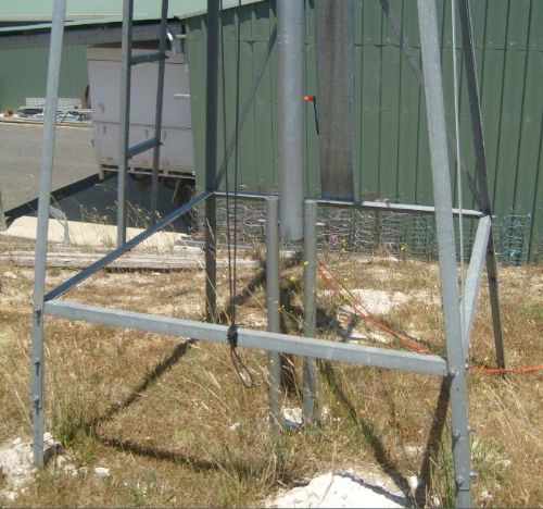 Hi all, I had an old 4 post windmill tower left over so I decided to use it as tower for the 500watt turbine. Problem was to get the turbine to sit on top of the tower but still be easy to lower to the ground for maintenance or in the case of very strong winds (something we are not short of here). I had seen Downwind's design and decided to incorporate the hinged pole and swing-over latch at the top into my setup. Guy wires were a severe inconvenience, hence the mill tower. The cross braces on one side of the tower were removed and re-sited to just past the middle of the tower with the top being completely open. A 75mm galv light guage water pipe was hinged at the bottom just above the lower cross brace (left this one in its normal place). This allows the pole and turbine to be lowered to the ground, ending up about 1 metre from the ground.(a nice height for working on). The pole is winched up and down using a light weight boat winch. At the top is a swing-over latch that combined with the winch, stops the pole from coming down. The bit I like, is the "no guy wires" David M. |