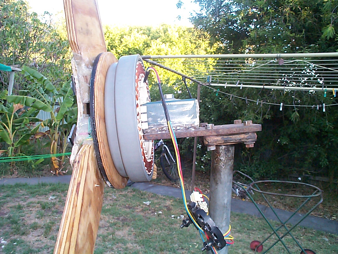 Hi fellow windmillers, first i would like to thank Glenn, Greg and Kiwi John for thier recent input, basically i have been looking at the best way to set up my F & P to gain most power. I have a property at Murray Bridge with Wind Power that can only be described as unrelenting. The wind has destroyed 2 sets of blades at 1200mm and i have now reduced my new set of blades to 900mm, i will fit up the new unit next weekend. I am deciding weather to rewire this unit to delta or leave it the way it is and put it up. Bench testing of this F & P 100s unit seems to be giving a heck of a lot of power ie i turn the unit slowly by hand and rectify it with an auto alternator rectifier and it puts out 30 + volts DC by the multi meter, i expect that given the wind power here that it would put out 500 + volts AC, i have seen my windmills spin so fast that they sound like jumbo jets !(a bit scary at times ) i need to rectify to usable DC battery bank charging and that seems to be the main problem. Any way here is a couple of unfinished photos. I have cut the shaft and placed a steel disc behind the rotor, the timber plate is a packer to overcome the stub that the plastic nut would normally be. The blades are from 18 mm ply all resined and the chords are fibreglassed, there is then a fibreglassed ply plare and 3 steel pieces of flat drilled out with 2 1/2" bolts fitted completely thru to the steel plate rhat has been drilled and taped, need to fit and balance the tail yet. Bob . Bob from Murray Bridge, SA |