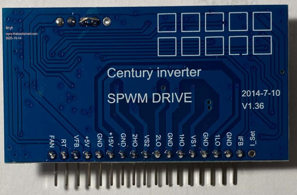 Some inverter boards from aliexpress come with an SPWM module marked "Century". ![]() Even though it is pin compatible with the more common EGS002, it is undocumented. From testing, the one I received is configured for bipolar SPWM, and I cannot change it. So be ready to swap it out with EGS002. |