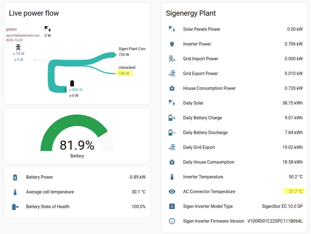 I also made use of the government battery rebate and chose a Sigenergy system. My installation consists of a 10 kW single-phase inverter paired with a 24 kWh battery, which has been running since October. The system includes three strings, each with twelve 440 W panels connected to the inverter, sized to meet winter demand and allow for future EV charging. Like other owners of SP inverters, I’m expecting a replacement sometime early next year. So far, the inverter’s AC connector has shown no signs of overheating, even under sustained loads of 4–6 kW, with connector temperatures typically remaining below 30 °C. The replacement inverter is expected to come with a 12-year warranty rather than the standard 10 years, and hopefully the company will be around to support it long term. Beyond the mobile app, I use Home Assistant, which pulls data via Modbus over Ethernet (enabled by the installer during commissioning). I’ve also built a simple temperature monitoring setup using an ESP32-C3 and a DS18B20 sensor attached to the inverter’s AC connector. In Home Assistant, I’ve configured an automation to send alerts to my phone if the connector temperature exceeds a set threshold. The battery cell temperature generally sits around 30 °C. Overall system self-consumption ranges between 150 and 200 W, averaging roughly 170 W. |