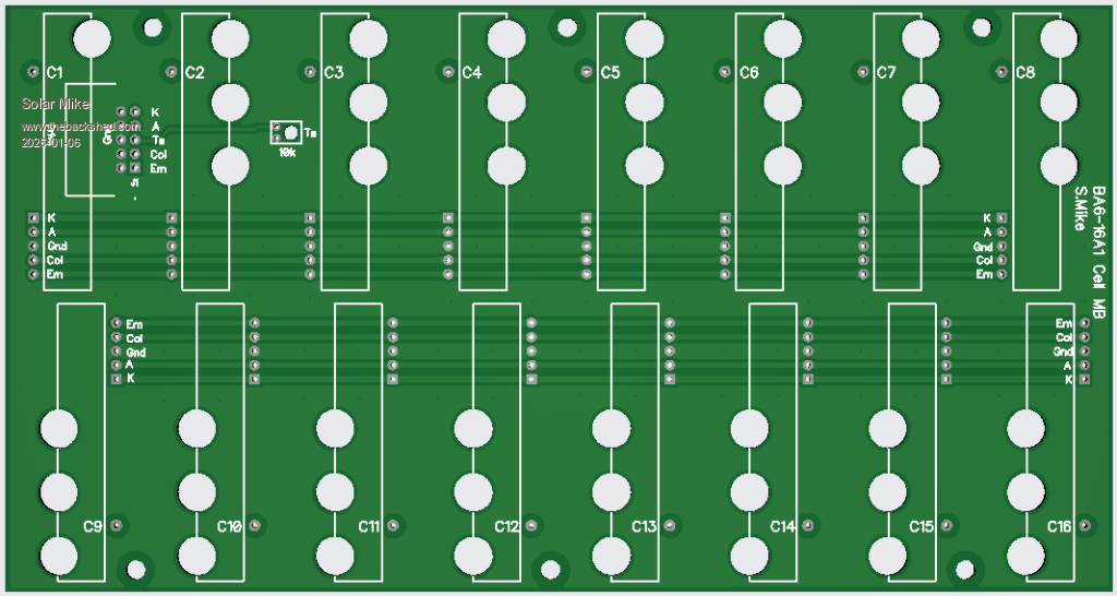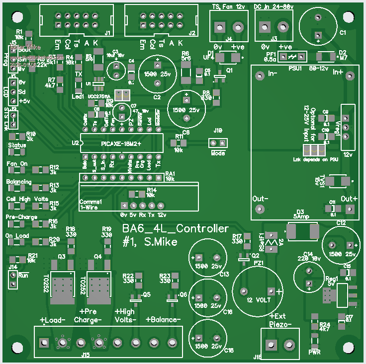 I have built a number of Lifepo4 and Lead Acid multi-cell battery balancers over the past several years, both passive and active types; they all work in various degrees, some better than others. Add to the mix accurate measurement of each cells voltage and the design gets more complicated. The passive types discharge a load resistor across any individual cell when its cell voltage goes above a high set point under charge, depending on the load resistor, quite a lot of heat can be generated, requiring a large heat sink and perhaps a fan. They do have the advantage that the load current is known and doesn't depend on the voltage difference between other cells. The active types using a large ferrite toroidal core with windings linked to each cell and synchronous current pulses work very well, however to get high load currents the circuit impedance must be in the mill-ohms region when cell voltage differences are low, reading the individual cell voltages is also tricky with all the voltage spikes. Under ideal conditions where cells are matched, balancing can be achieved with a couple of amps; cells I am using are re-cycled 100 - 400 AH and various ages - manufactures, so rather large load currents are required to keep "runner" cells in line. A passive balancer with a known load current works best here, this design is a modification of previous variants, where a mother board hosts individual cell module pcb's linked to each cell in the battery bank. A controller connects to one or two MB's allowing either 16 - 32 cell batteries. Cell boards each have their own cpu, here a very cheap Pixaxe 08M2LE and talk to the controller via opto-couplers for isolation. In the past I have used a form of PWM for cell communications, where the width of the pulse specifies the cell address and corresponding cell voltage in milli-volts, this is quite fast and should work ok on 32 cell banks. Here are the pcb's that will be sent off to be made in the next day or so, I will draw up the schematics when its all working and any bugs ironed out. Controller 100x100mm 4 layer: Can drive a couple of large DC relays for main contactor control and inverter pre-charge. ![]() Cell Board 33 x 50mm: The 3.3v regulator is only used when monitoring 6V lead battery cells. ![]() Mother Board 200x106mm: Large holes in the pcb are to allow air from a top mounted fan cool the 0.35r (10 amps) 50w resistors mounted below the main pcb, using a large alloy plate as heat sink. ![]() Cheers Mike Edited 2026-01-06 12:57 by Solar Mike |