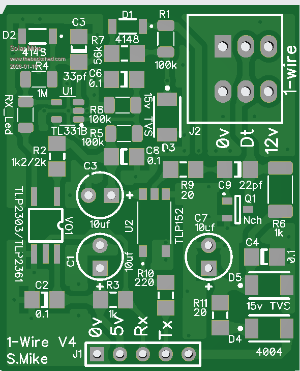 The 1-Wire communications setup may be of interest, it is based on a 12v logic "wired OR" system, having a large hysteresis to get noise levels down. The Master device supplies 12V,0v power to the slaves, with data isolation by opto - couplers. 2 way control bus floats at 12v when not active. Schematic: ![]() PCB 33 x 40mm: ![]() ![]() Gerbers: 6 pcbs fit on a 100x100mm board, I get them made 1.2mm thick and cut with a very large tin snips 1WireV4Gerbers.zip Cheers Mike Edited 2026-01-10 20:56 by Solar Mike |