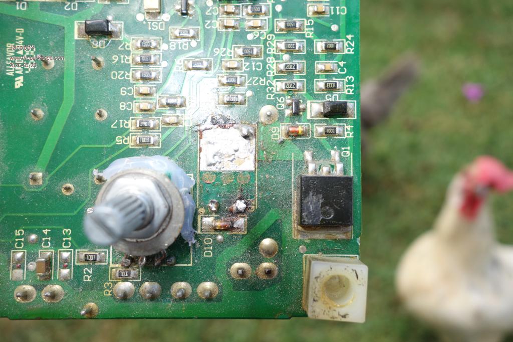 Please excuse the messy soldering and hot glue on the replacement potentiometer. And you can see where I removed the destroyed mosfet already.