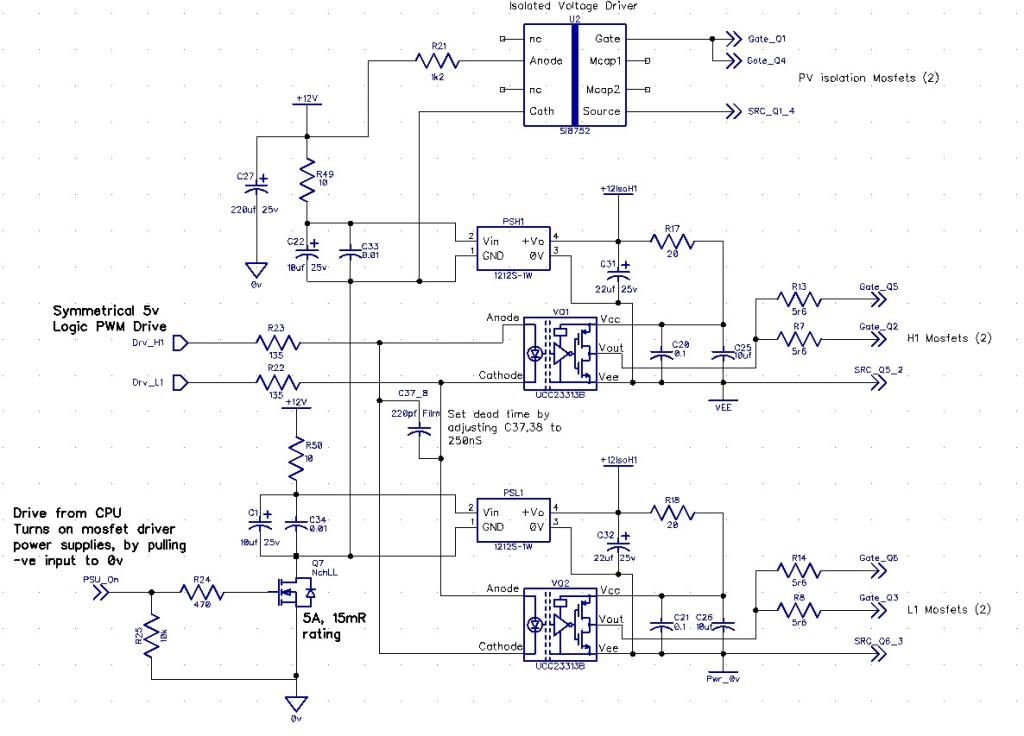Schematic showing the mosfet interlocked drivers and isolated bias supplies, I haven't drawn in the mosfets nor the main power electrolytics, buck choke etc.
