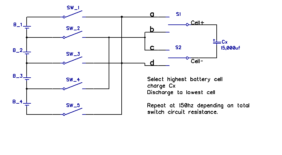 Yes, it would work for 4 cells or so. I tried that idea, using super capacitors, with 16 cells and it was way too slow to do any meaningful balancing. Its the small voltage difference between the cells, a few tenths of Volt at most, that make it difficult for the capacitor to accept meaningful charge in the time allocated. I'm now using Warpspeed's inductive balancer that copes much better with 16 lithium cells of different vintage. |