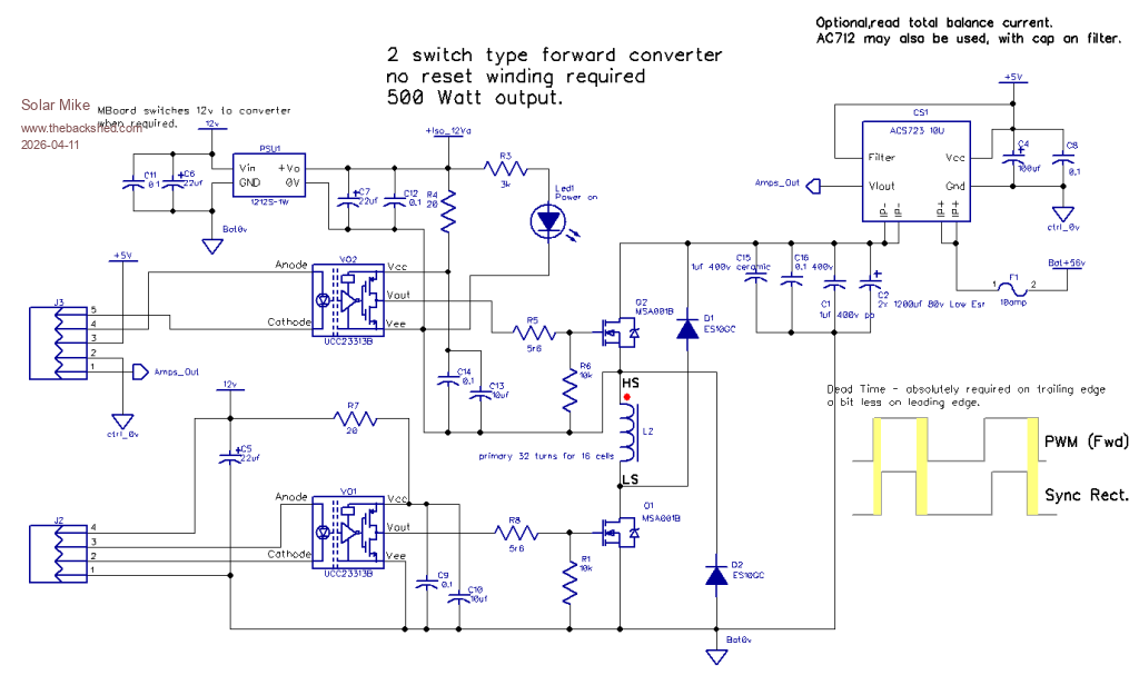 This new design uses a two mosfet switch forward converter, as this have some advantages over a single switch method; no reset winding is required and less stress on the mosfet switches, disadvantage being it has more components, cost however is similar.