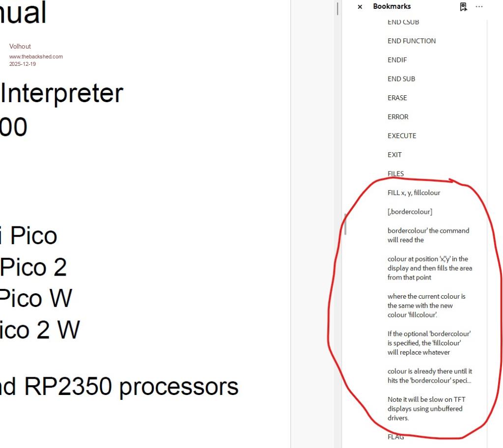 Geoff, It may be just me, but I find the command list (in several places) is corrupted. Maybe you could confirm this is also shown at your original ? See below picture. This is the user manual that I just downloaded (19/12/25 13:00 CET). ![]() Volhout PicomiteVGA PETSCII ROBOTS |